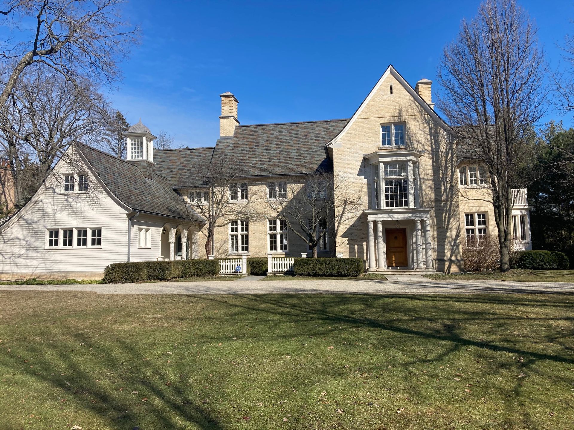 A large brick house with a gray roof and white shutters.
